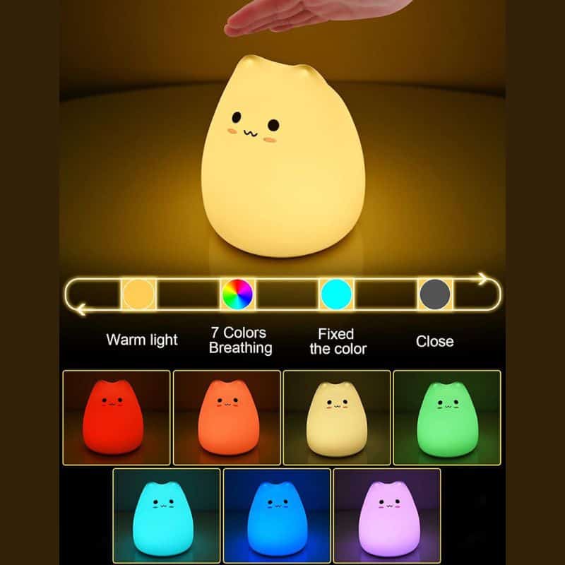 Experience a world of color with a simple interaction. The Silicone Cat Lamp features intuitive operation: just tap or pinch its soft body to cycle through a soothing warm light, a vibrant spectrum of RGB colors, and then off. This feature makes it an engaging and fun light source, perfect for setting a calming or playful mood. The LED bulb provides a gentle brightness of 52LM, ideal for use as a night light.